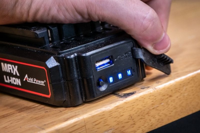 The pack does, however, have a 5V 1.5A USB charging port on the backโand we like that. It also sports a 3-LED battery level indicator. That gives you a good idea of your remaining charge before you get to work.