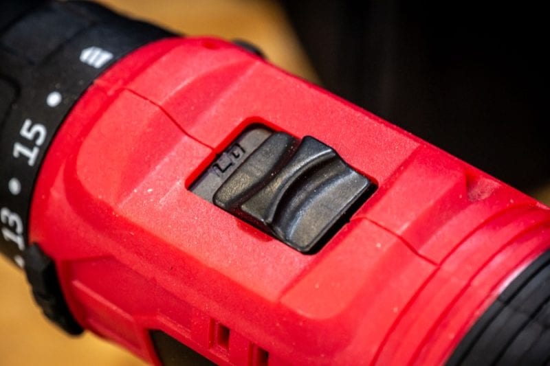 On top of the drill, thereโs a typical 2-speed mechanical gearbox switch. Your forward/reverse switch sits directly below within easy reach of your thumb and forefinger to control the direction of the brushed motor.