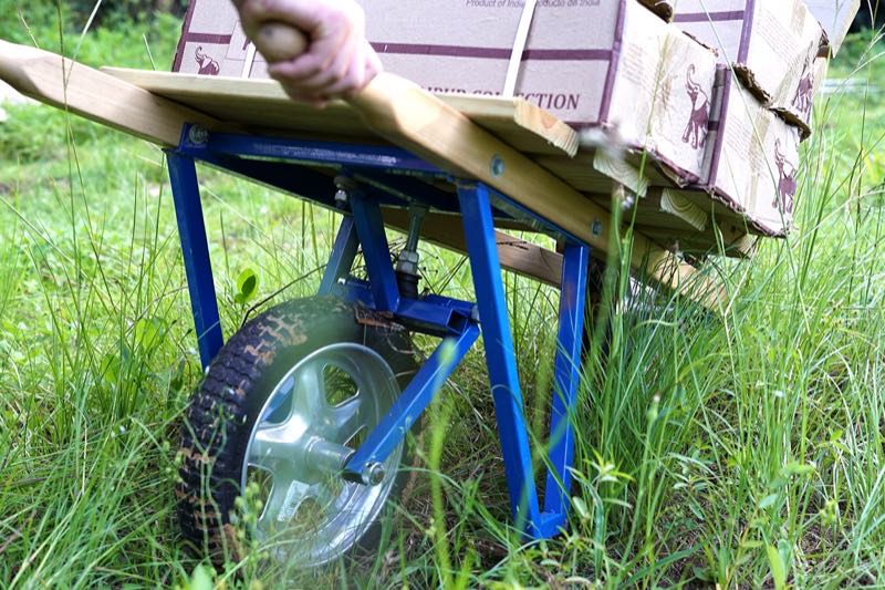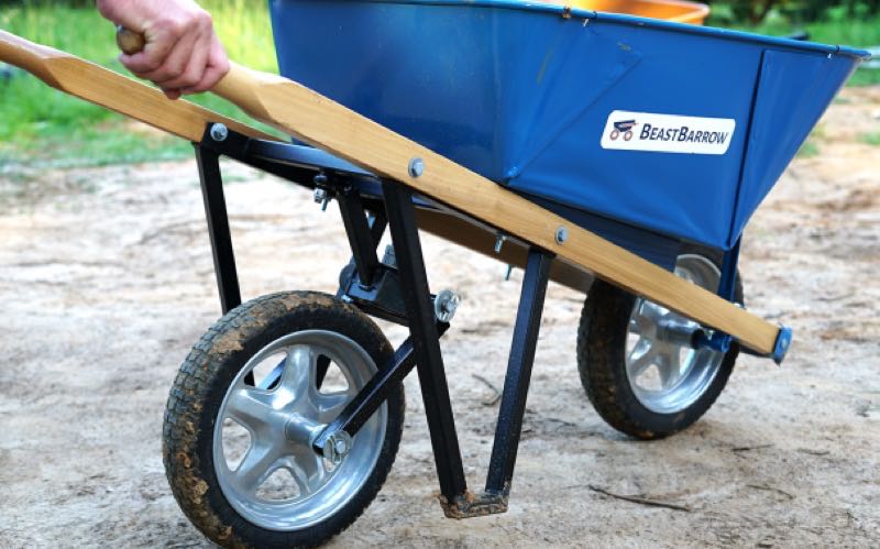 The swivel wheel allows the user to move across uneven terrain. As you roll over, say, a pile of dirt, both wheels grip the surface, resulting in a more stable wheelbarrowing experience. If I could draw a really obvious parallel, the BeastBarrow is to a wheelbarrow what a bicycle is to a unicycle.