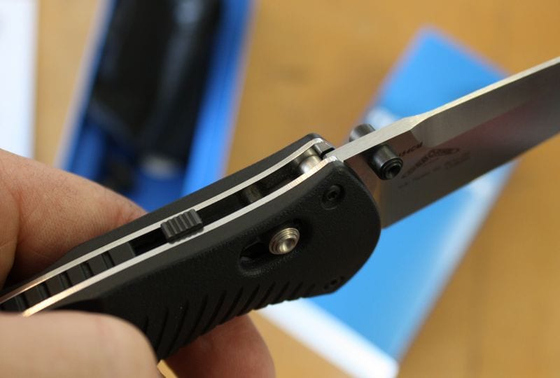 As the knife is used and experiences wear, by design this lock actually becomes stronger. The beauty of the AXIS lock is that, unlike liner locks as found on many folders, your fingers are never in the way of a closing blade. To close the blade, use your forefinger and thumb on each side of the handle to pull back on the studs and the blade will then be free to swing close. Since this is an assisted opening knife, as you close the blade you will feel the pressure of the spring in the action. To make sure the blade does not get accidentally deployed or closed once it is opened, there is a ingenious locking slide button on the back of the knife handle that is both effective and unobtrusive. It simply takes the flick of a finger to activate or deactivate it.