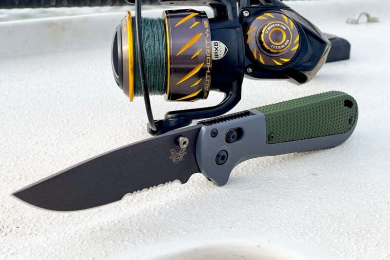 For the Redoubt, Benchmade uses its Grivory handle with a gray and green color scheme. Itโs one area that really sets this knife apart from the others in my collection. Grivory is a lightweight thermoplastic that is extremely tough in the field. While the handle makes the balance weight-forward, I donโt have any complaints in my day-to-day use. Since thereโs no metal to corrode and I spend the majority of my fishing time in saltwater, the Grivory handle is a plus for me.