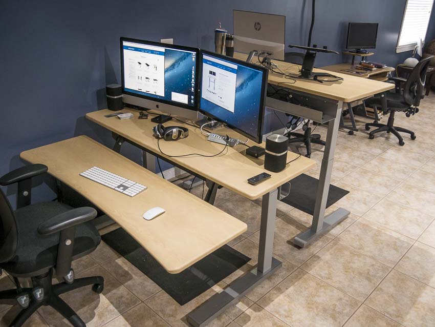All of the Ergotron standing desks feature very cool โ€œTilt-and-goโ€ wheels on the rear that let you lift the front and move them forwards or backward as needed. This made it very easy to maneuver the desks into place once they were assembled in our office.ย Each of the desks also uses an Elevate Power Bar with 12 outlets. This lets us plug all of our cords into a single power strip. We like this power bar because it has multiple mounting methods and also spaces the receptacles 2 inches (5 cm) apart. Given the number of transformers we use, this comes in handy.