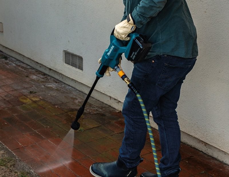 In the XWH02โs case, you also have the benefit of a cordless design that uses the same 18V LXT batteries as the rest of your Makita tools. It reaches up to 320 PSI in the highest power setting. Using an 18V 5.0Ah battery (sold separately), you can clean for up to 80 minutes per charge. Makita also designed it to use either a standard garden hose connection, the onboard siphon valve, or a 2-liter bottle (with an adapterโnot included) as a water source, giving you plenty of flexibility.