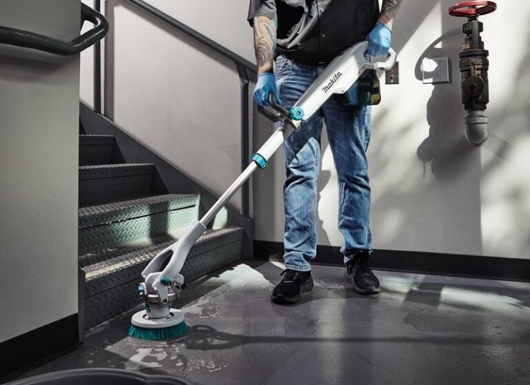 Makita is the first major Pro-targeted brand to introduce a telescoping power scrubber, and they went all out. Its high brush speeds and multiple attachments make it a really versatile cleaning machine. The GSP01 features aย brushless motorย powered by a 40V max XGT 4.0Ah battery, reaching top brush head speeds of 650 RPM. You can also choose from three speed modes to set your speed to the application.