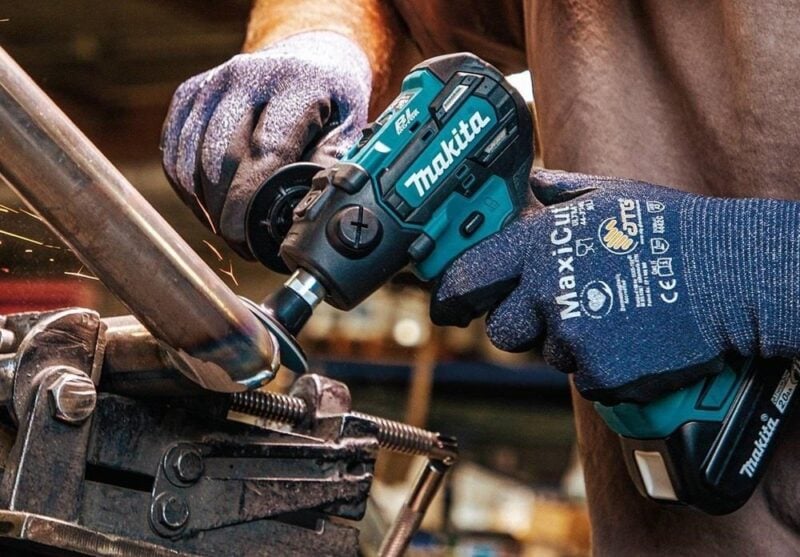Switching between accessories is also a tool-free process, with a spindle lock to secure your accessory. Makita equipped it with a trigger lock-in button, a side handle, and a rubberized grip. With a weight of just 3 pounds without the battery, it aims to be a lightweight solution for metalworking and woodworking pros looking for a compact solution for detail sanding/polishing jobs.