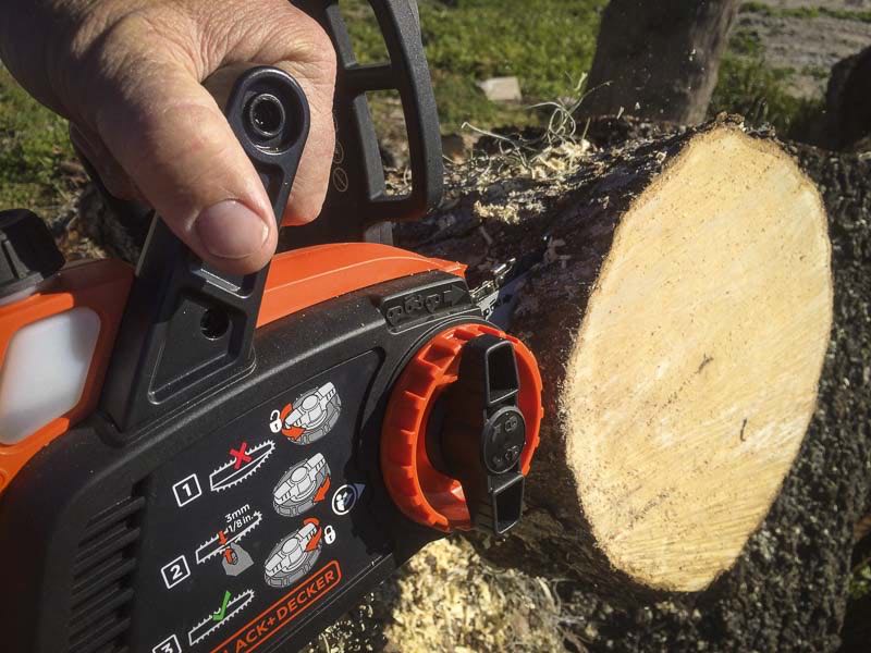 The most notable feature of the Blackย andย Decker 40Vย chainsawย is its side-loading 40V battery which powers the saw without the need for 2-cycle fuel. You still need to add chain oil to keep the Oregon 12โณ bar and chain lubricated, but the battery and electric motor are whatโs driving the saw as it cuts. The chain tension is controlled by a two step process of loosening the black bar adjust locking knob on the right side of the saw which then allows you to tighten the orange tensioning knob to adjust the proper tension of the chain. You want a maximum of 1/8โณ of give at the bottom of the chain when you tug on itโand it should snap back snug when you let go. You only need a little slack, as the chain will stretch and expand slightly when it heats up during use.