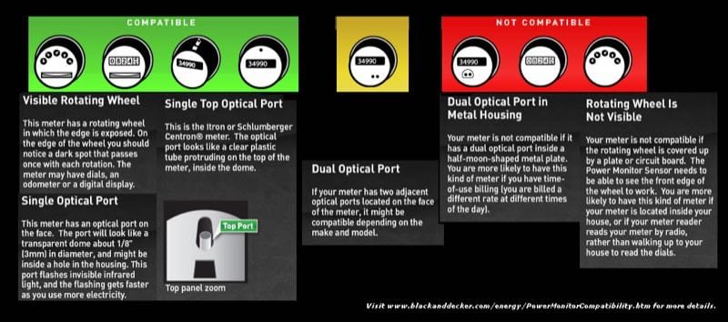 We must stress that it is important to make sure that you have a compatible electric meter with this system before you purchase it, so that you can avoid the frustration of not being able to use it. The good news is that it should work with about 90% of the residential electric meters that are in service in the United States. Just to be helpful, we included this little graphic to better help youย see what meters the Power Monitor will work with.