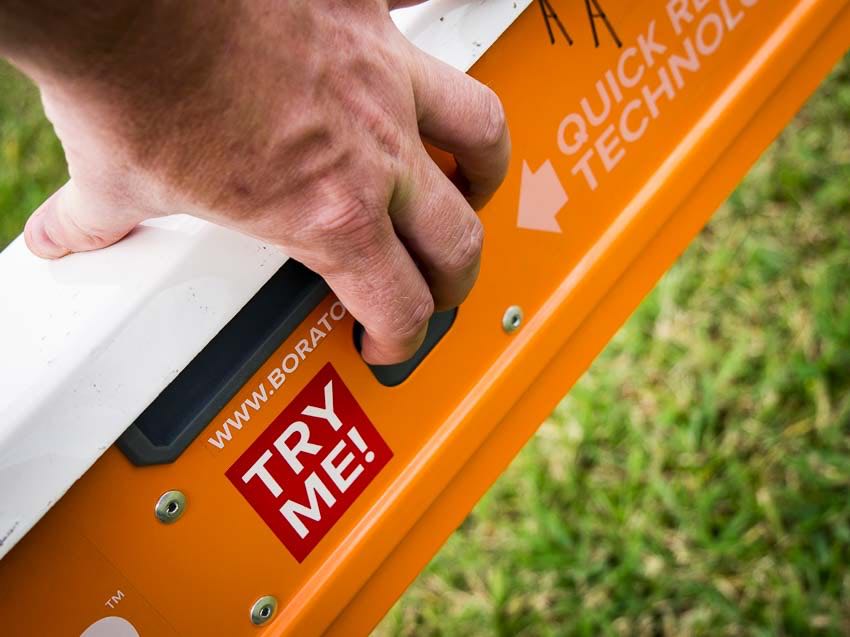 The Bora Speedhorse is named for its quick setup and takedown.ย Once you get where you want to work, setup and takedown really are simple. Hold the Speedhorse up and hit the release under the handle โ the first set of legs will flip down and lock in place. Hit the release for the other legs and youโre in business.