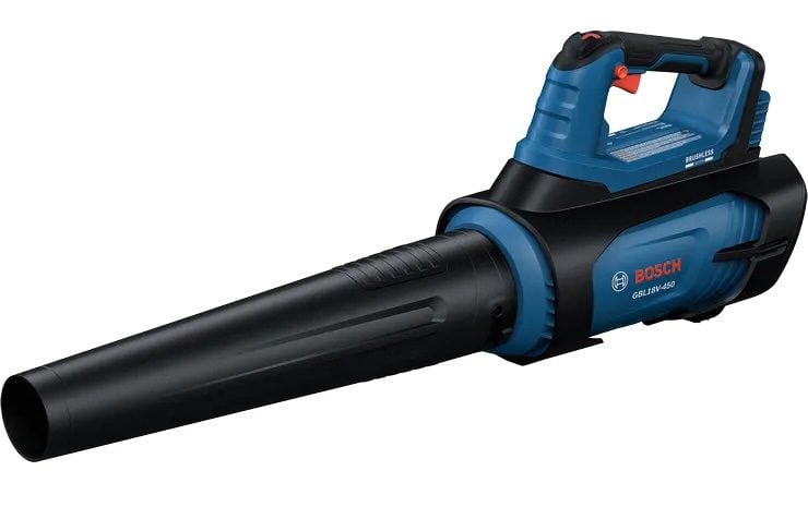 Bosch’s 18V blower delivers about what we expect for a homeowner-class blower. At the top end, you get airflow levels of 450 CFM and airspeeds of 123 MPH, and the speed control wheel lets you set your blowing speed to the application. It’s also equipped with convenience features like a trigger lock for continuous runtime and a hanger slot for easy storage.