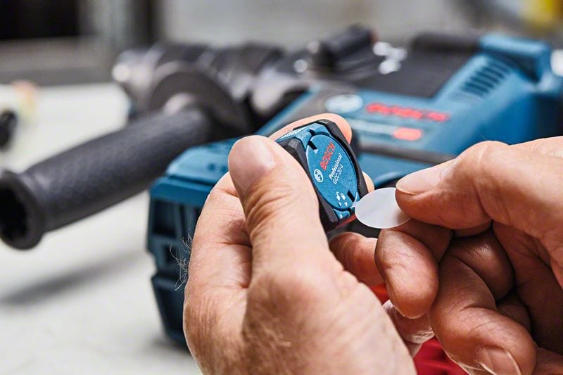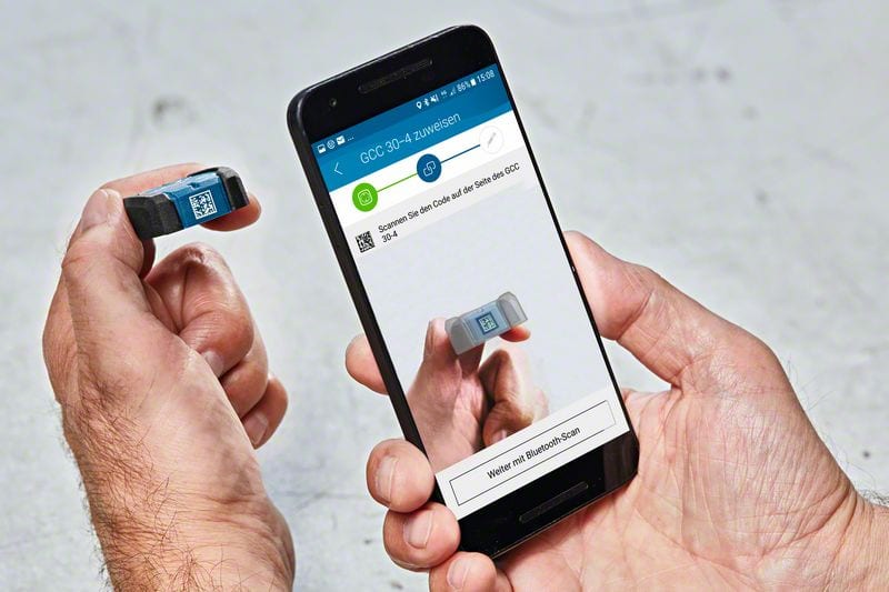 At the heart of the system is the Bosch GCC 30-4 tracking tag. This allows you to attach a Bluetooth tracker to any tool or equipment. If it has a cord, you can crimp it on. If it doesn’t, you can glue it or screw it in place. It utilizes a simple coin cell battery for power, and a QR code on the side enables easy identification using your smartphone. With a footprint less than 1-1/2″ square, it’s easy to find an installation point on most tools and equipment.