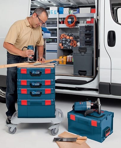 The Bosch L-Boxx seems to have taken everything about the Systainers and improved it. The L-Boxx system stacks and opens more easily and costs less. They have both side and top handles so you can move your tools about as needed, however you desire. The stacking mechanism is different than the Festool Systainers in that it uses a patented one-click system that exists on the sides of the boxes.