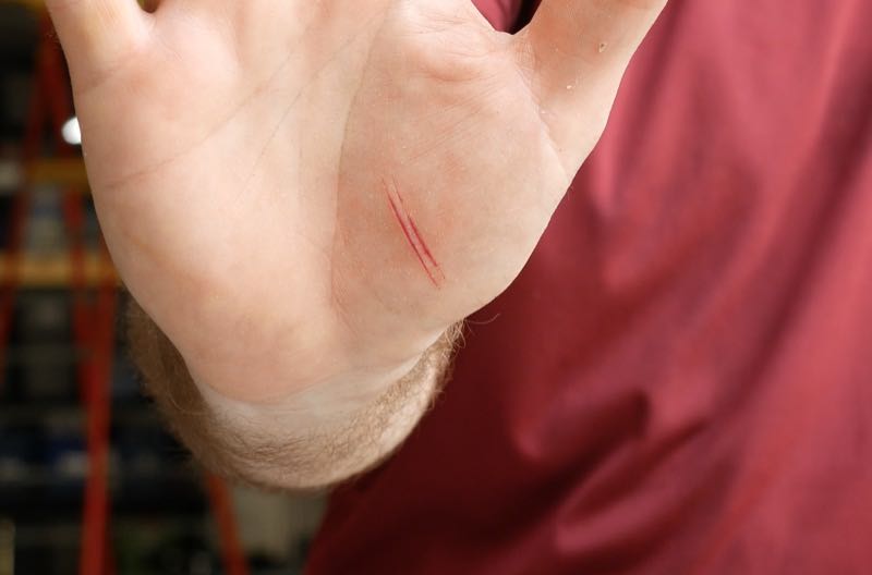 The result was four lines representing, we believe, the edges of four particular blade teeth. The finger bled a bit, but the blade did successfully drop below the surface. Given the mathematics and trigonometry behind a four-tooth result, you can reasonably assume that the Bosch Reaxx would allow up to a 1/4-inch depth of cut if the speed of impact was aggressive enough.