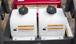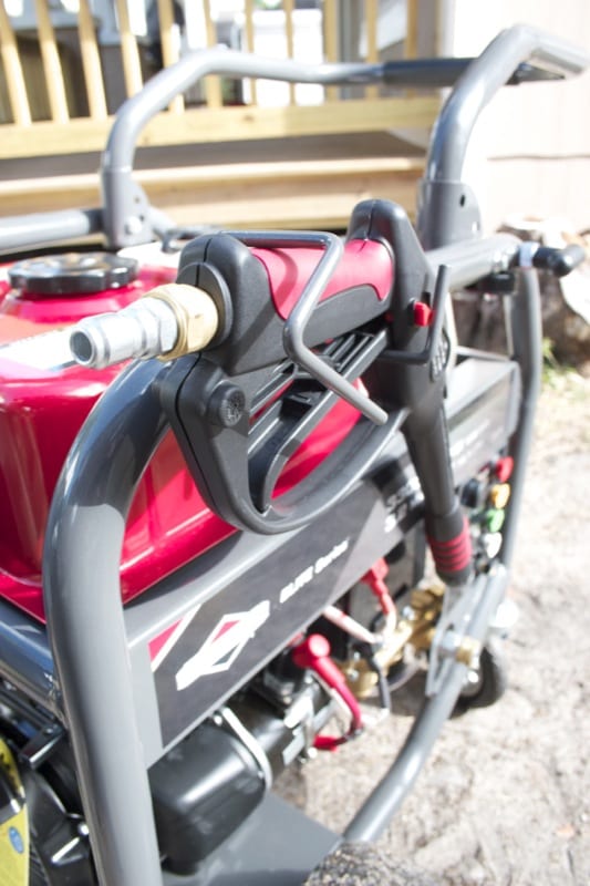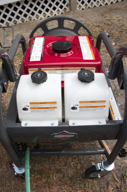 I also liked the two self-contained [1 gallon] solution reservoirs. They are actually built right into the pressure washer, which is pretty cool. You could, for example, switch between soap and bleach, and the amounts can be regulated using the control underneath. With that, you can dial it back so that you donโt blow through all of it too quickly. The way itโs set up you can use undiluted solutions because the Briggs & Stratton will mix it for you with the incoming water. It just makes everything simpler and you can avoid carrying around a bucket and a siphon adapter. You also get the added benefit of not having to shut down the system and release the pressure to take it off. So you can imagine, having the self-contained system is rather nice.