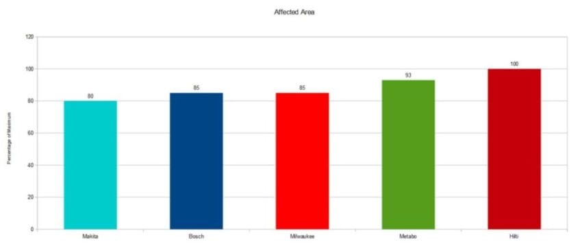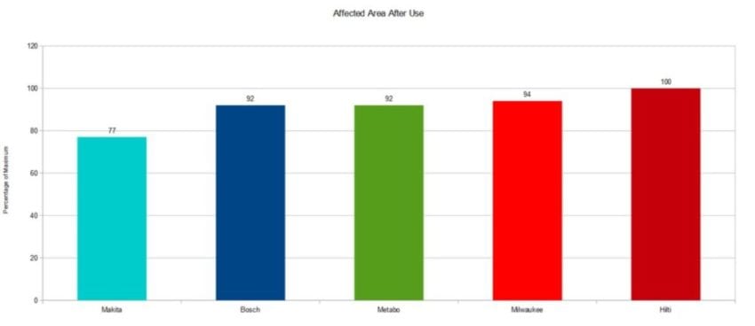 For the partially cleared area (affected area), the order doesnโt change. It ranges from Hilti (3-3/8โณ) in first to Makita (2-11/16โณ) at the bottom. This time, thereโs more separation, but thatโs not a ton. Makita still clears 80% of what Hilti does.