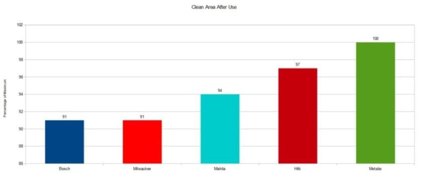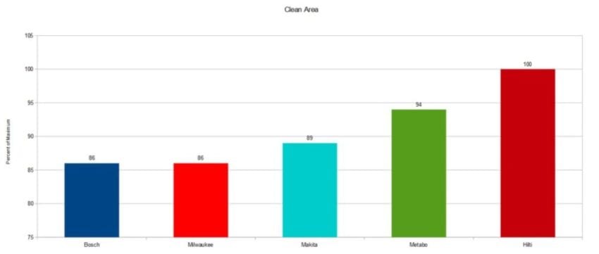 For partial cleaning area, Hilti keeps its top spot, dropping to 3โณ while Bosch finally separates from Milwaukee with 2-3/4โณ and Makita brings up the rear at 2-5/16โณ.