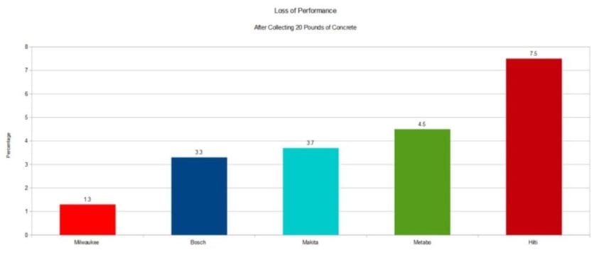 As it was in the water lift test, Hilti has the biggest drop in performance with a dirty (but auto-cleaned) filter. It loses nearly 14% of its performance compared to Milwaukee who only dropped a hair over 2% and Bosch with a 4.35% performance loss.