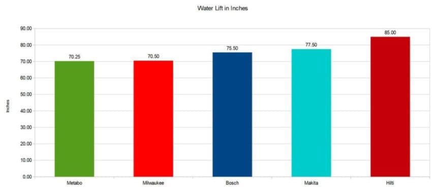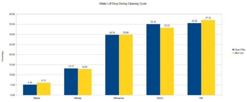 Hilti drops the most, losing more than 35% of its water lift during cleaning. Bosch is right behind, also losing just north of 35%. Once again, Makita is looking great here, only dropping a hair over 5% during cleaning.