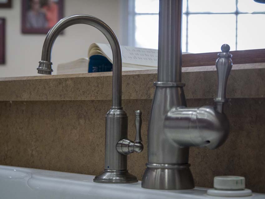 By design, youโd want a sink with a hole at the extreme right. Thatโs the perfect location for theย Franke water filtration faucet. Ours, however, lacked that, so we were forced to mount it to the left of the Frankeย Farm House FHPD180 Satin Nickel faucet. While not ideal, it allowed us easy access to both faucets without the handles being in each othersโ way. As we had a ceramic-coated sink, we couldnโt simply add a new hole.