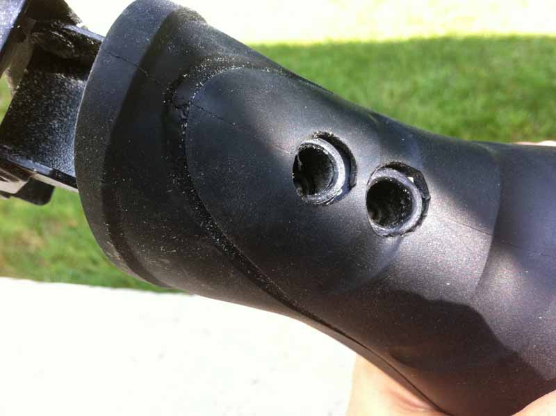 The rubberized overmold is easy to hold and quite comfortable, but itโs also not very grippy, particularly with ungloved and sweaty hands. This isnโt a huge deal, but we do like some texture on our grips, and this one is almost completely smooth. At the base of the front grip are Allen-type bolts that can be removed to allow access to the internal mechanism and removal of the shoe assembly.