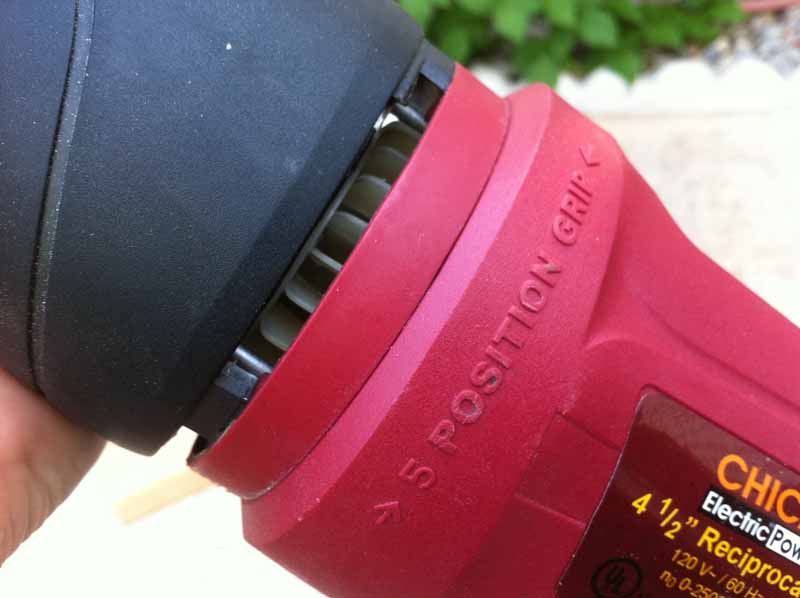 The very first thing we noticed with the Chicago Electricย rotatingย handleย reciprocatingย saw was that the pivoting shoe was a bit stiff. It actually pivots up to a full 30 degrees, which is rather nice, but it was really tough to get moving. Once we started using the tool and working it back and forth (and, um, after adding some lubricant!), it loosened up for easier use. We donโt want the shoe to be floppy, but I also donโt want it to keep me away from getting it flush to the workpiece, either.