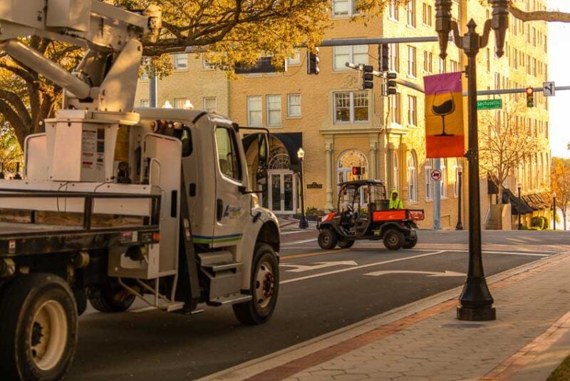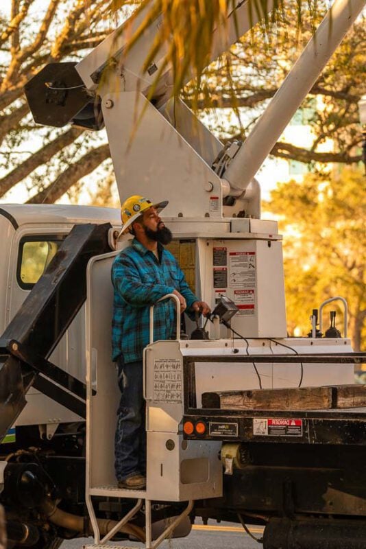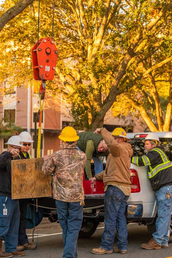 In the Florida Outdoor Sculpture Competition, we have to reserve enough parking spaces for the crane and the artist with their trailer. Then, when we actually do the pick (lifting the sculpture off of the trailer) we need additional personnel or police to help block the city street for about 10 to 20 minutes. It is very tempting for the traffic control personnel to watch the installation of the sculpture because you don’t see that happening every day. It is however much more important that they pay attention to what they are doing. Here, traffic safety equals crane safety!