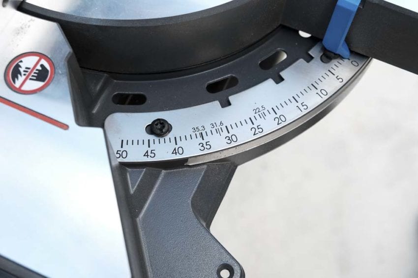 • 50ยฐ left miter/60ยฐ right miter capacity with 10 miter detents and positive stops