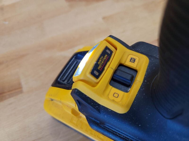 DeWalt made a big stride forward in terms of safety on this drill. The torque-sensing Perform & Protect Anti-Rotation system immediately shuts down the drill when it senses a bind-up, indicated by the LED work light turning red. This system will activate in forward and reverse and requires a much smaller swing arc to activate the anti-kickback system than weโve seen with other drills.
