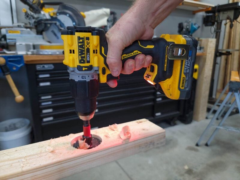Overall, the DCD806 performed well, but as I expected, we did have to drop down into low gear with the larger bits. Additionally, DeWalt doesnโt include a side handle, so exercise caution in those high-torque applications.