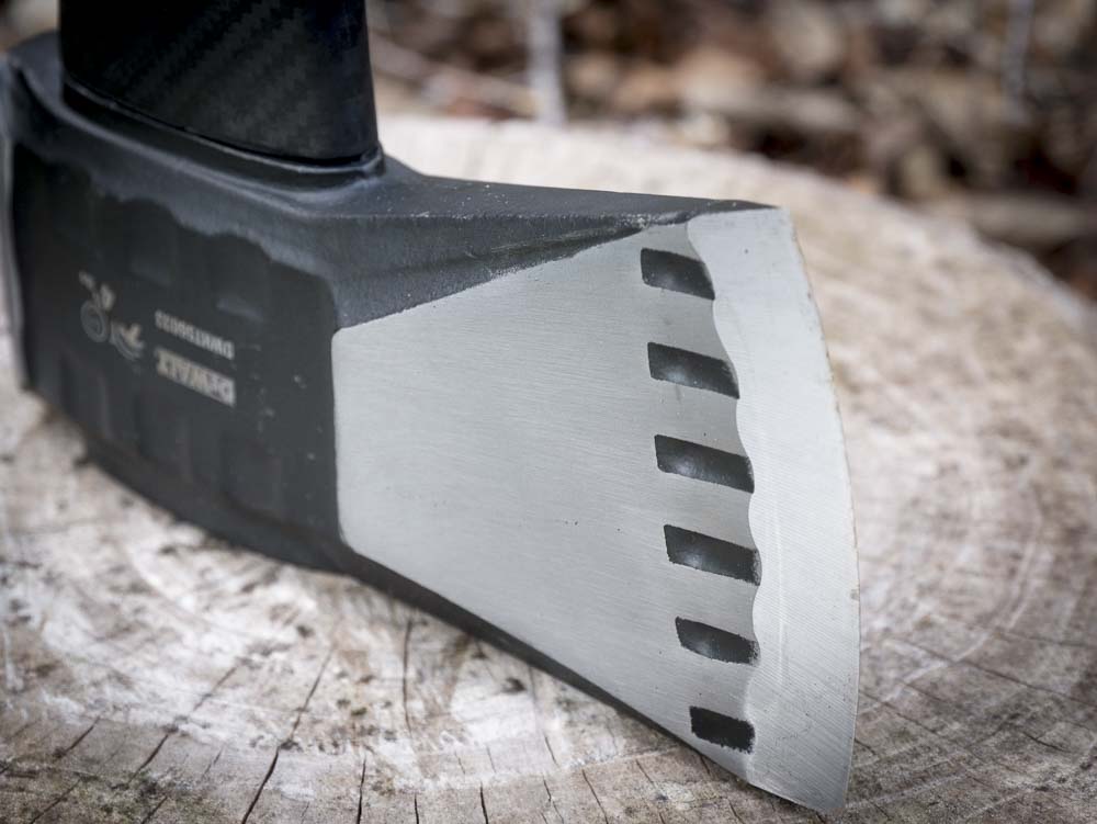 Scalloped Cutting Edges:ย Scalloped edges offer some relief from wood pressing in against the blade. It allows you to drive the edge deeper and release it easier than a standard axe head. Compared to my other axe in this size class, it does make a measurableย difference in both the strike depth and release. Donโ€™t mistake it for perfect, though. Youโ€™ll still have to work it back and forth in some cases.
