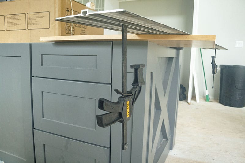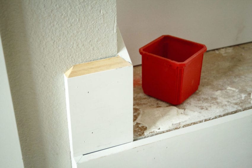 But what is easy are compound miters with theย DeWalt FlexVolt 60V Max Track Saw. I had a skirt boardย that was running along the wall of the staircase (at the angle of the staircase, of course). At the corner where the wall terminated, I marked the board, took it off the wall, and then clamped the track saw to it to make a perfect compound miter. This is the easiest, cleanest, and fastest way Iโve ever done a cut like it. It turned out beautifully.