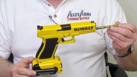 What happens when a DeWalt enthusiast decides to go for his concealed carry permit? Well, thereโ€™s a slight chance you might get something like this โ€“ although weโ€™d have to wonder if this should result in a new โ€œcamouflaged carryโ€ permit. Mark Bilicki, of Greenvilleโ€™s Allen Arms worked with gunsmith Jamesย Oberkirsch to develop a fully-functioning DeWalt Glock 21 .45. Except that this one is styled to look just like one of the companyโ€™s new cordless drillsโ€ฆ complete with a drill bit emanating from the front of the gun, just below the barrel. While the drillย doesnโ€™t work, the thought is that if you really want a hole that bad, the Glock can probably take care of it.