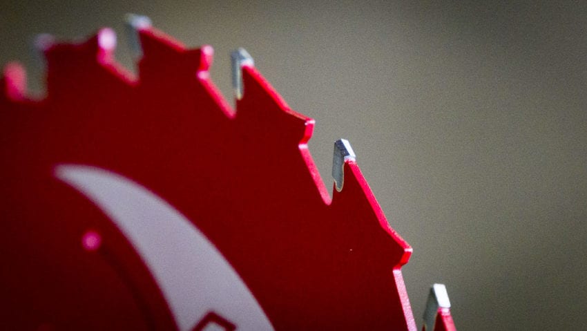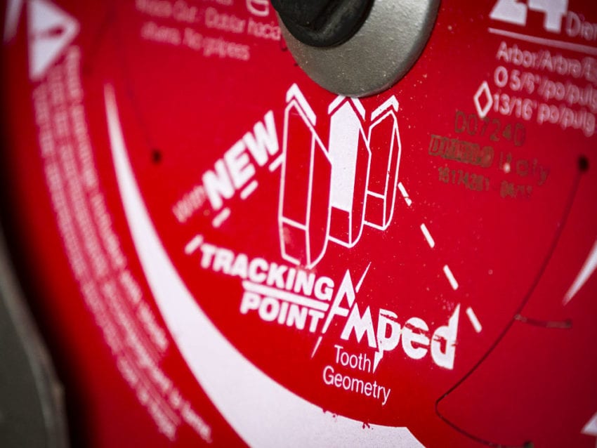 Theย Diablo Demo Demon with Tracking Point Ampedย primarily takes advantage of the new Tracking Point. With a typical ATB (alternate tooth bevel) configuration, one tooth grind goes left and the next one goes right. You can see the effect in the scratch the Bosch Reaxx Table Saw left in my hand when we tested it.