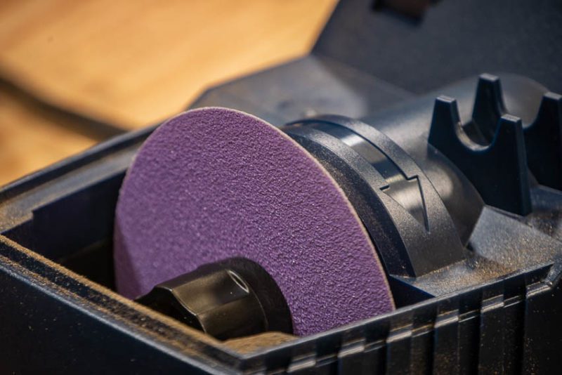 The sharpening wheel is a flexible ceramic disc rather than a solid stone and thereโs a spare in the box. The benefit is that itโs more forgiving than a stone if your angle of attack is a little off.