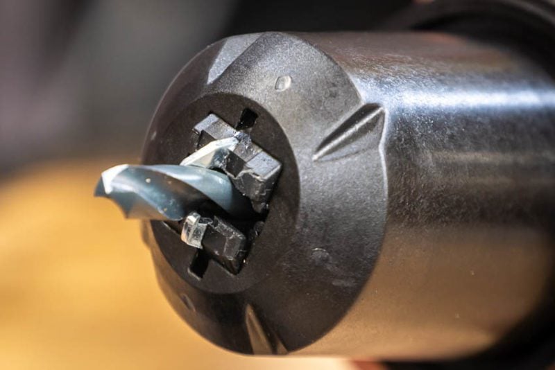 Start by inserting the bit you want to sharpen into the chuck with about 1/2 an inch sticking out and tighten it slightly. You still need to be able to adjust the bit a little.