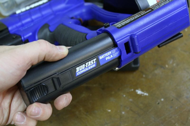The main body of the tool is plastic, but don’t think for a minute this makes it feel cheap or lightweight. The overall weight of the Duo-Fast DFCR175C Cordless Roofing Coil Nailer is a tad over 7 pounds which is actually a few pounds heavier than its pneumatic cousins. While some might be put off by the heft, the nailer truly has a great balance and feel. With overmolded rubber grips, a belt hook, and even a stretchy lanyard that you can attach to your tool belt to ensure that if it does get away from you when you are on a roof, it will not fall to its demise.