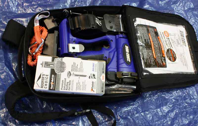 Pretty much what we saw from our experience, is that you can do most repairs with just a single trip up and down the ladder. The beauty of the Cordless Roofing Coil Nailer is that you are free to go where you need to with no attachments to the ground and you have a fully functional nailer in your hand and a pretty handy place to store it when you are not using it. There is enough space inside the backpack to hold the tool and a case of nails which gives you enough firepower to lay a full two squares of shingles.