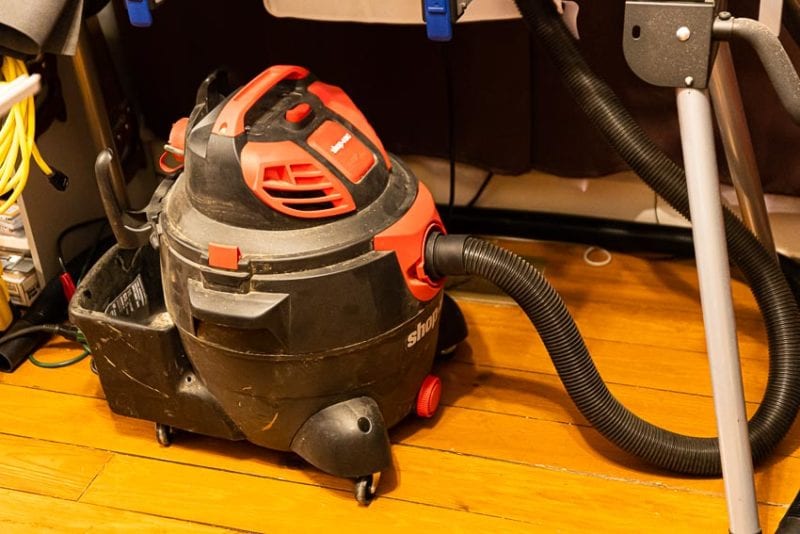 I live alone, so this means I do what I want in my house without having to get spousal approval. When I bought my house, I wanted my living room to be my woodworking studio. My studio/living room is the size of a one-car garage- 10.5โ x 23.5โ with 10โ ceilings throughout my house. Dust control is essential to keep the rest of my house clean. I had to choose, shop vac vs dust collector to keep the dust down.