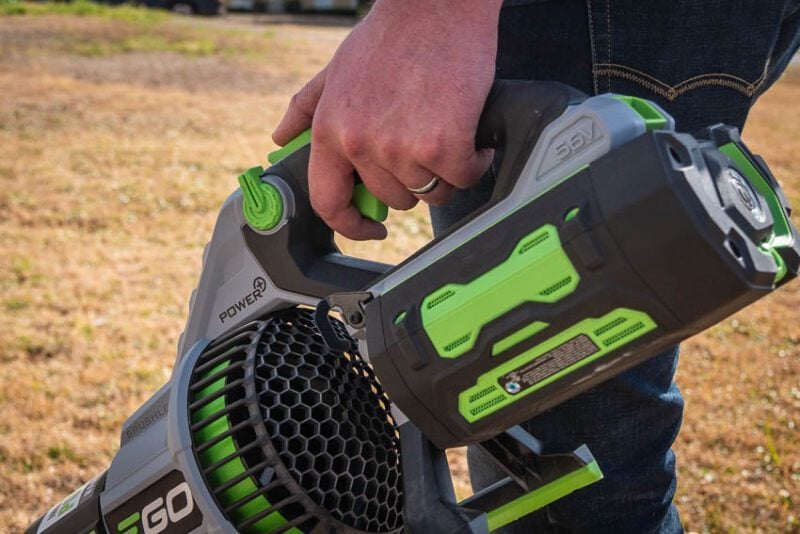 Like other EGO blowers, there’s a turbo button that immediately kicks the brushless motor into high gear for maximum airflow no matter which setting you have the cruise control on. The fact that it’s a separate button helps you manage your battery life by using the most power only when you need to.
