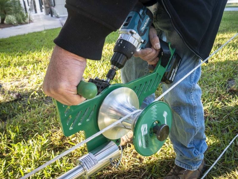 Even before the first trigger pull, we noticed a few impressive features of the Versi-Tuggerโbesides the size. First, you can use just about any drill in your toolbox. The Makita XPH07 hammer drill that came in our kit more than sufficed. Next, the capstan is tapered dramatically which makes quick work of unloading the line, tape, or rope. Also, the puller head sheave adjusts to pull from any direction the wire comes fromโdown, up, and sideways.