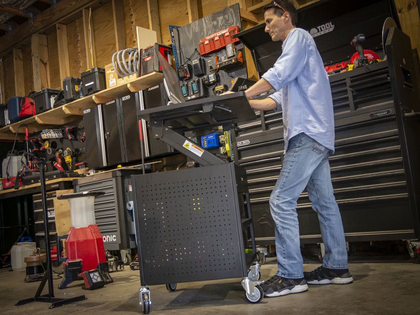Compared to a typical service cart, the sheet metal is a lighter gauge and the MDF top isn’t as shop-friendly as steel or solid wood. However, it doesn’t feel like it’s cheaply built. The casters roll super-easily and make it a breeze to use on concrete floors in a shop, garage, or warehouse.