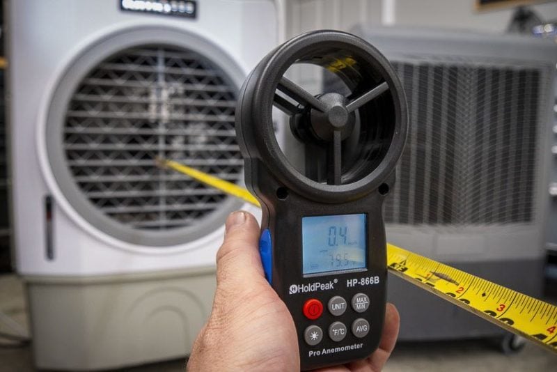 - Airspeed: We check airspeed at several intervals to see how well the cooling effect transfers as you move away from the cooler. Models that reach out farther effectively cool large spaces better.