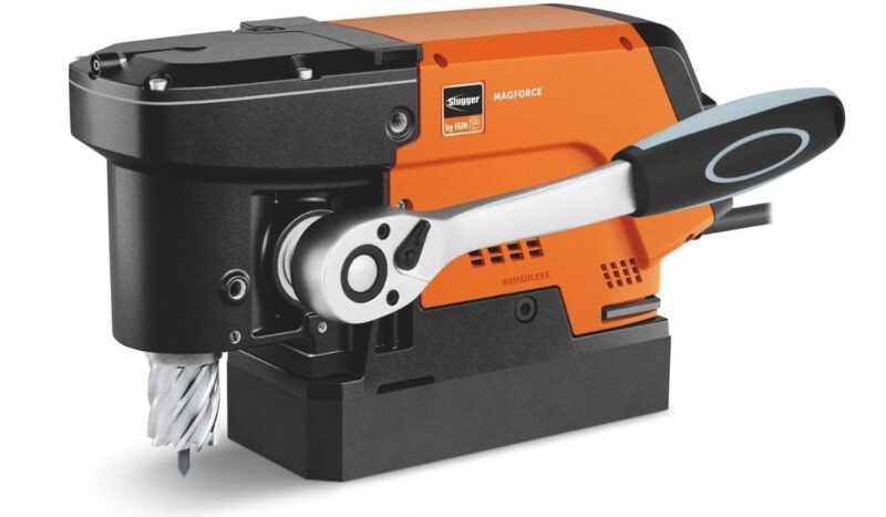 Fein tells us the JMC MagForce 90 mag drill is the smallest and lightest magnetic base drill that features a forward and reverse operation. Its 10A (1150W) brushless motor provides variable speeds between 130 and 660 RPM.
