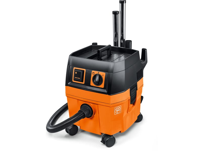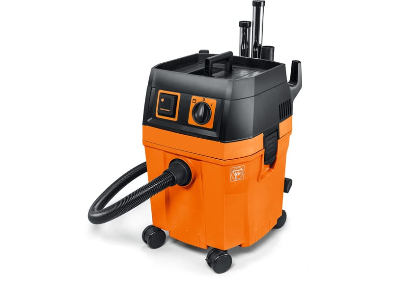 The length of the cord and hose combined give you a pretty generous reach of about 30 feet. There is a tool coupling that comes with the Fein Turbo for connecting to the dust extraction port found on many power tools. It also has suction control built into it so you can dial in what you need without going overboard. An Autostart outlet on the front includes a start up delay that prevents power spikes from damaging equipment. The design of the wheels allows them to freely move 360 degree which makes the unit easy to maneuver. ย The top is built to act as a small storage area and the attachment organizer features a hook to hold the wrapped cord and hose.