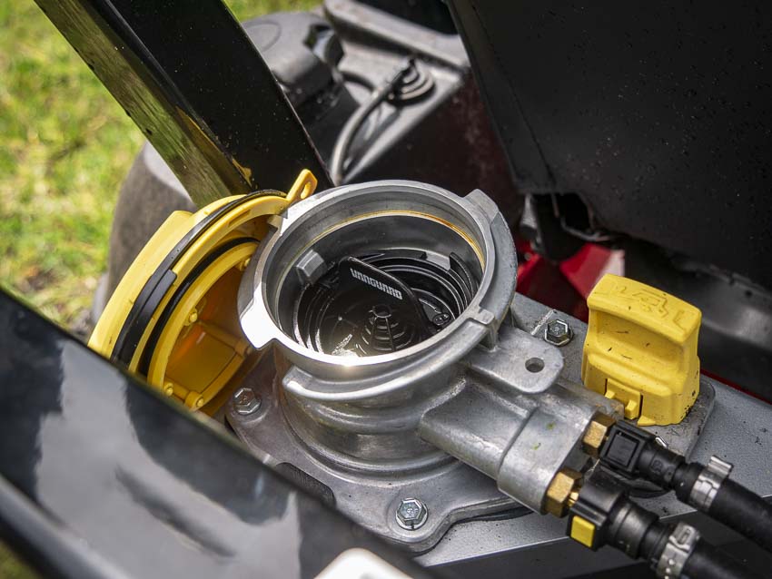 The Ferris 2100Z includes dual 5.5-gallon fuel tanks for 11 gallons of capacity. An onboard switch left of the seat lets you switch between tanks.