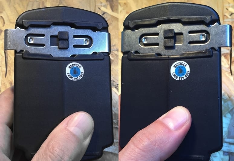 A belt clip is built into the bottom of every battery. The clip can be pushed to one side or the other, permitting the drill to be hung on the userโs left hip or right hip. This is also a very intuitive feature.