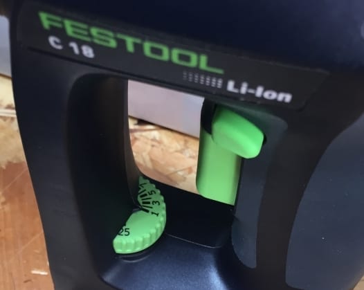 A bank of LEDs is built into the bottom of the main grip, and the batteryโs level is displayed when the trigger is squeezed. I really preferย LED displays built into each battery because, in order to check the level of a battery on the Festool C18, it must first be inserted into the tool.