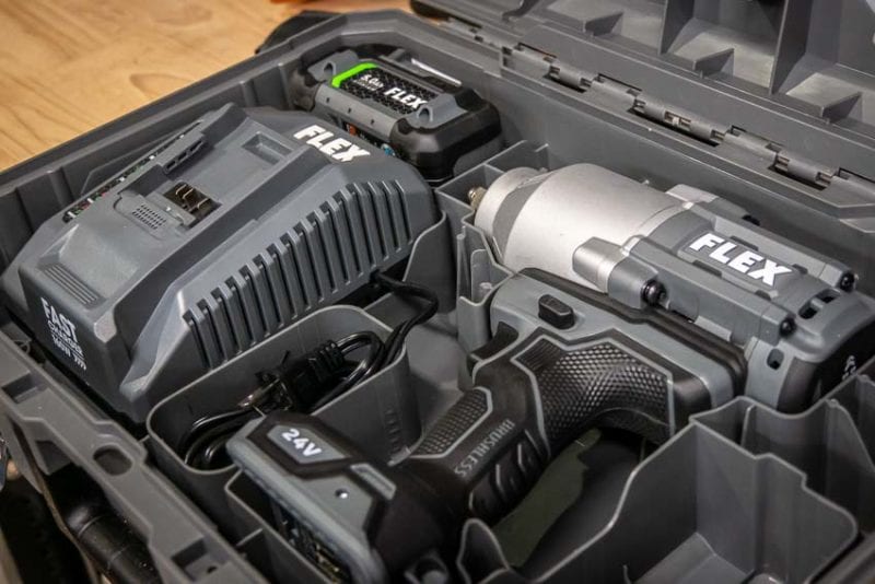 This high torque 24V brushless impact wrench kit price is pretty reasonable when you consider everything it includes. For $299, you receive the bare tool, one 5.0Ah battery, a 160W Fast Charger, and a sturdy hardshell case. Flex offers a 5-year โEnd-To-Endโ warranty which covers the tool, battery, and charger with registration.