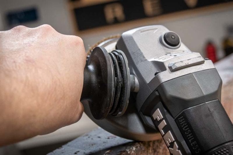 Flex includes a kickback sensor on the tool. In the event you bind up your grinder wheel or or it kicks back on you, the motor will automatically stop. Despite that control, thereโs no fast electronic brake when you release the switch. It takes about 2.5 seconds for a Type 27 grinding wheel to come to a stop, so itโs not as slow as some.