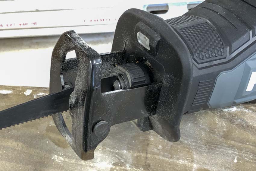 The longer-than-average 1-inch stroke length combined with a 3000 SPM stroke rate let you fly through materials that leave most of the one-hand competition in the dust. There’s also an always-on orbital action that helps when you’re cutting wood. It’s not as aggressive as a full-size saw, but it is something to be aware of when you’re cutting metal. Make sure you’re keeping the shoe in contact with the material to smooth out the cuts.