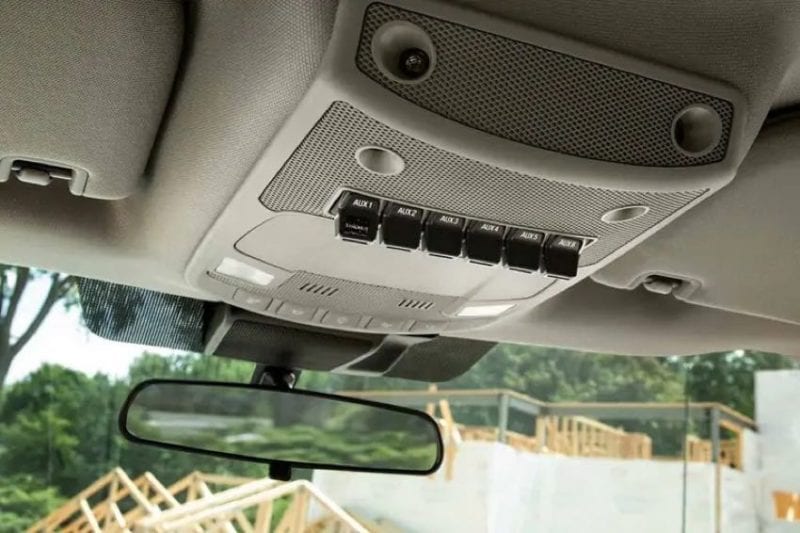 Ford has integrated the switches, with fuses and associated relays, into the overhead console/storage compartment.